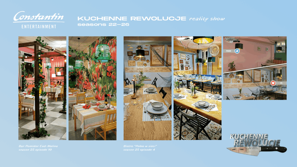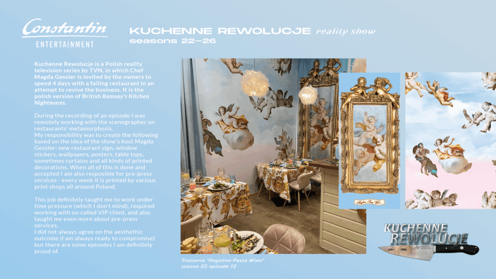 Pracując we współpracy ze scenografem i na podstawie koncepcji prowadzącej program Magdy Gessler, projektowałam elementy wizualne przestrzeni: szyldy, plakaty, fototapety, naklejki, podkładki, bieżniki, serwety i inne drukowane detale wystroju w duchu environmental design.
